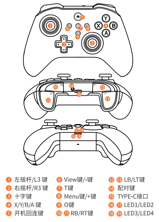 2、手柄关机状态,按住【O键】不松开,再按【房子键】开机连接,LED1/4灯蓝灯快闪;