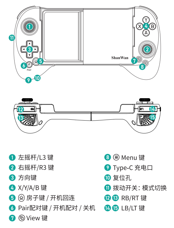 蓝牙连接 手柄关机状态下,先按【R1键】不放,后按【房子键】开机,指示灯紫灯闪烁。打开手机蓝牙,搜索到“ShanWan Q13L”点击连接。使用ShootingPlus软件进行映射游玩。